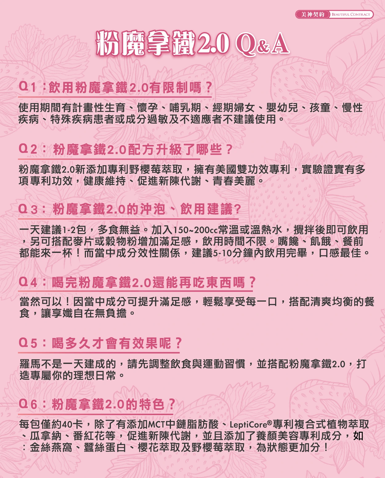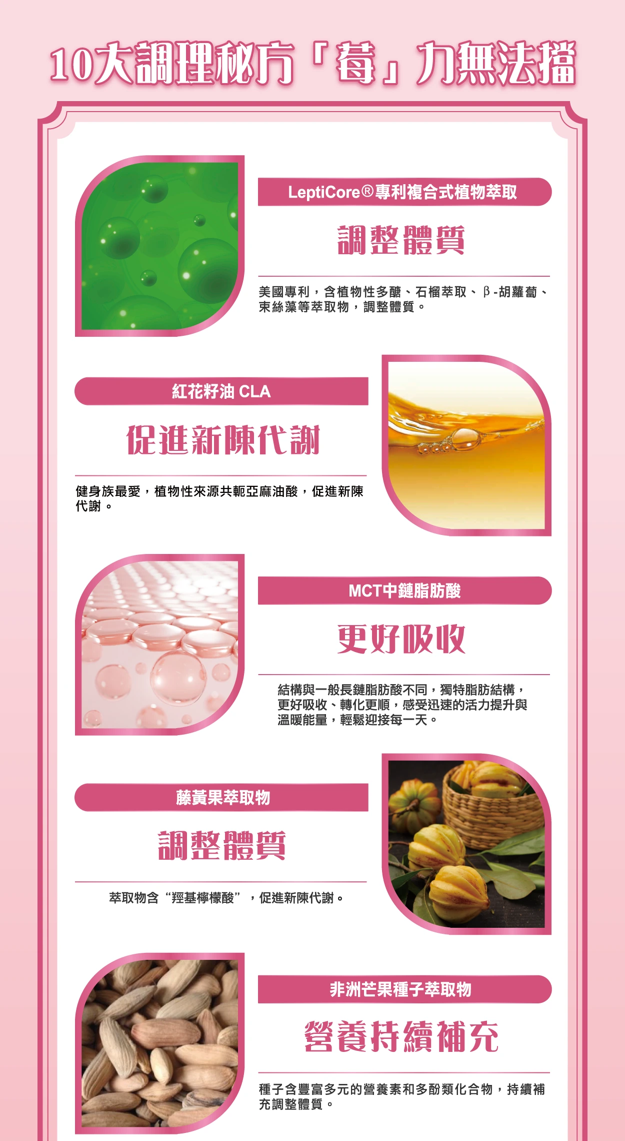 成分:MCT中鏈脂肪酸(中鏈脂肪酸甘油酯、辛烯基丁二酸鈉澱粉、脂肪酸甘油酯(植物性)、乳酸硬脂酸鈉、二氧化矽、麥芽糊精、碳酸鈣、酪蛋白鈉、維生素E (抗氧化劑)) 、小麥纖維、全脂奶粉、草莓粒、草莓粉、蘋果纖維、莓果百科(巴西莓、蔓越莓、覆盆莓、藍莓、石榴、草莓、麥芽糊精、西印度櫻桃、黑莓、山竹果、智利酒果、葡萄籽、枸杞)、紅花籽油CLA、瓜拿納萃取物、魔芋粉、甜菜根粉、專利櫻花萃取物(麥芽糊精、櫻花提取物、抗壞血酸、蘋果酸)、專利蠶絲蛋白(蠶絲蛋白、樹薯糊精) 、專利燕窩萃取物(麥芽糊精、燕窩提取物)、LeptiCore®專利複合式植物萃取(關華豆、刺槐豆、阿拉伯膠、石榴、Beta-胡蘿蔔素、束絲藻)、番紅花萃取物、白腎豆萃取物、大豆卵磷脂(含磷脂醯膽鹼、糊精、二氧化矽)、藤黃果萃取物、非洲芒果種子萃取物、專利野櫻莓萃取(野櫻莓萃取、麥芽糊精)、蔗糖素(甜味劑)。
