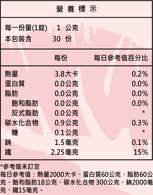 內容量:1公克/錠,30錠/盒。