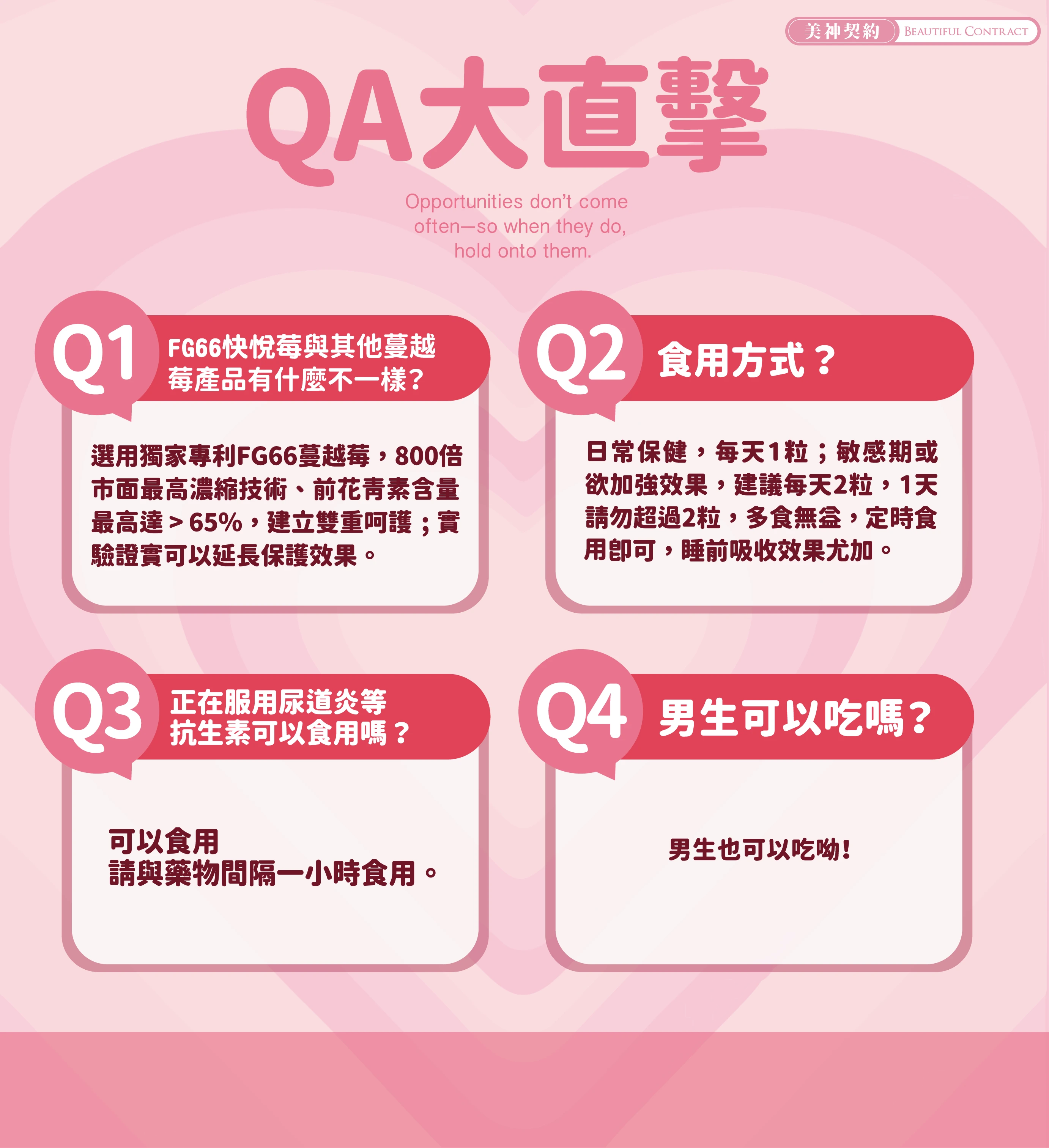 成分:FG66專利蔓越莓萃取物(800倍濃縮蔓越莓取物、蔓越莓萃取物(前花青素>65%)、麥芽糊精)、D-甘露糖、西印度櫻桃萃取物(含維生素C)、專利洛神花萼(含洛神花萃取)、專利芽孢乳酸菌(麥芽糊精、凝結芽孢桿菌)、橄欖葉萃取物、葡萄籽萃取物、專利石榴萃取物、蔓越莓濃縮粉(蔓越莓濃縮汁、麥芽糊精)、沙棘籽油粉(沙棘籽油、小麥纖維、糊精、維生素E)、專利南瓜籽萃取物、專利複合甘氨酸亞鐵(甘氨酸亞鐵、檸檬酸、麥芽糊精、二氧化矽)、硬脂酸鎂、甜菊萃取物(甜味劑)。
