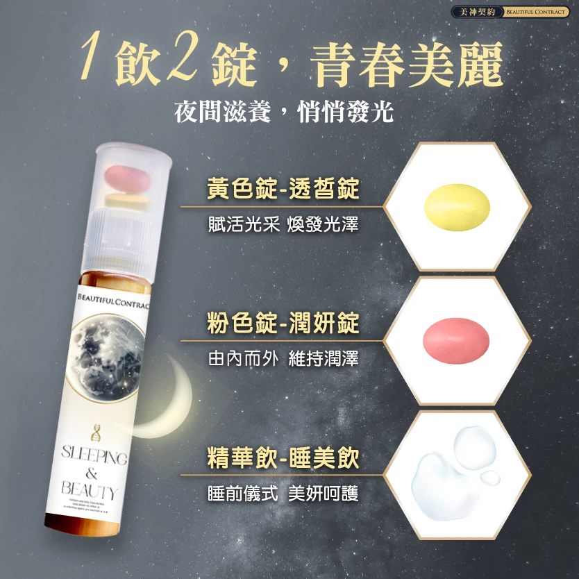 睡美飲成分:純水、異麥芽寡醣漿、鳳梨粉(鳳梨原汁、麥芽糊精)、專利余甘子萃取物、專利綜合莓果萃取物(七仙莓)(麥芽糊精、黑莓果粉、黑醋栗果粉、藍莓果粉、草莓果粉、覆盆莓果粉、蔓越莓果粉、巴西莓果粉)、卡姆果萃取物(含維生素C)、流行鏈球菌發酵物(含透明質酸鈉)、番茄萃取物(冰晶番茄)、專利金絲燕窩萃取物、專利金頂側茸子實體萃取物、專利鮭魚精巢萃取物、鰹魚彈性蛋白。
