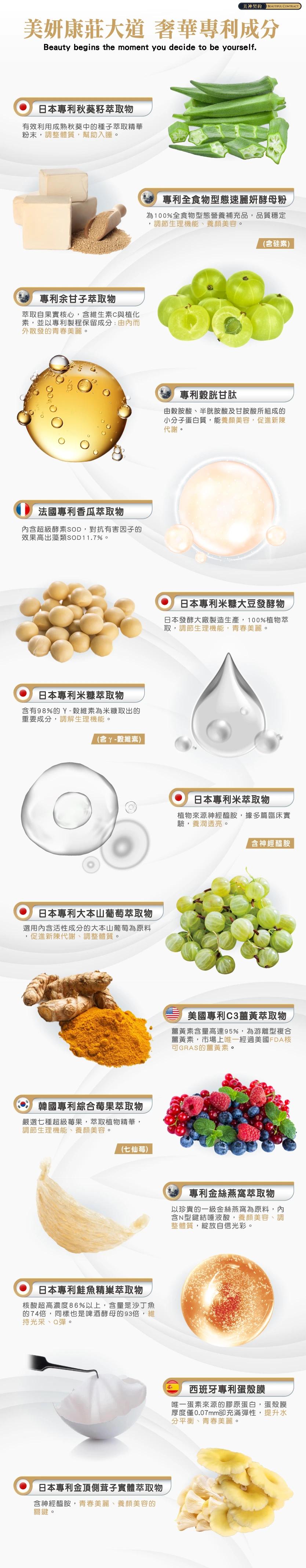 睡美飲成分:純水、異麥芽寡醣漿、鳳梨粉(鳳梨原汁、麥芽糊精)、專利余甘子萃取物、專利綜合莓果萃取物(七仙莓)(麥芽糊精、黑莓果粉、黑醋栗果粉、藍莓果粉、草莓果粉、覆盆莓果粉、蔓越莓果粉、巴西莓果粉)、卡姆果萃取物(含維生素C)、流行鏈球菌發酵物(含透明質酸鈉)、番茄萃取物(冰晶番茄)、專利金絲燕窩萃取物、專利金頂側茸子實體萃取物、專利鮭魚精巢萃取物、鰹魚彈性蛋白。