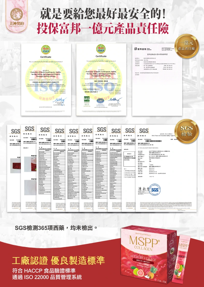 成分:MSPP®(專利魚鱗膠原蛋白、專利魚膠原蛋白)、紅心芭樂粉(芭樂原汁、麥芽糊精)、異麥芽寡醣粉、芭樂丁、西印度櫻桃萃取粉(西印度櫻桃提取物、玉米麥芽糊精) (含25%維生素C)、玉米胚芽抽出物(糊精、玉米提取物) (含1%賽洛美) 、鳳梨粉(鳳梨原汁、麥芽糊精)、專利紅石榴萃取物(紅石榴萃取物、麥芽糊精)、流行鏈球菌發酵物(含95%透明質酸鈉) 、專利山竹果萃取物、鰹魚彈力蛋白、甜菊萃取物(甜味劑)。
