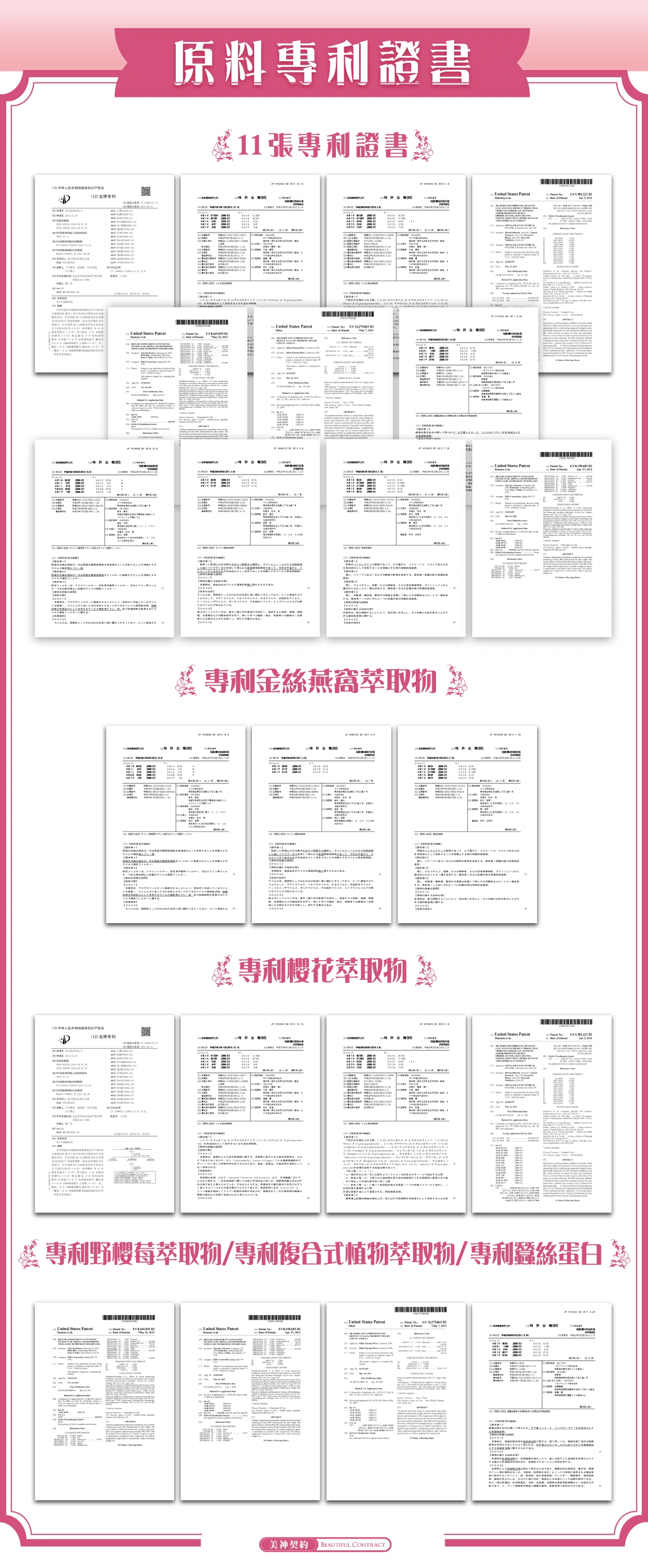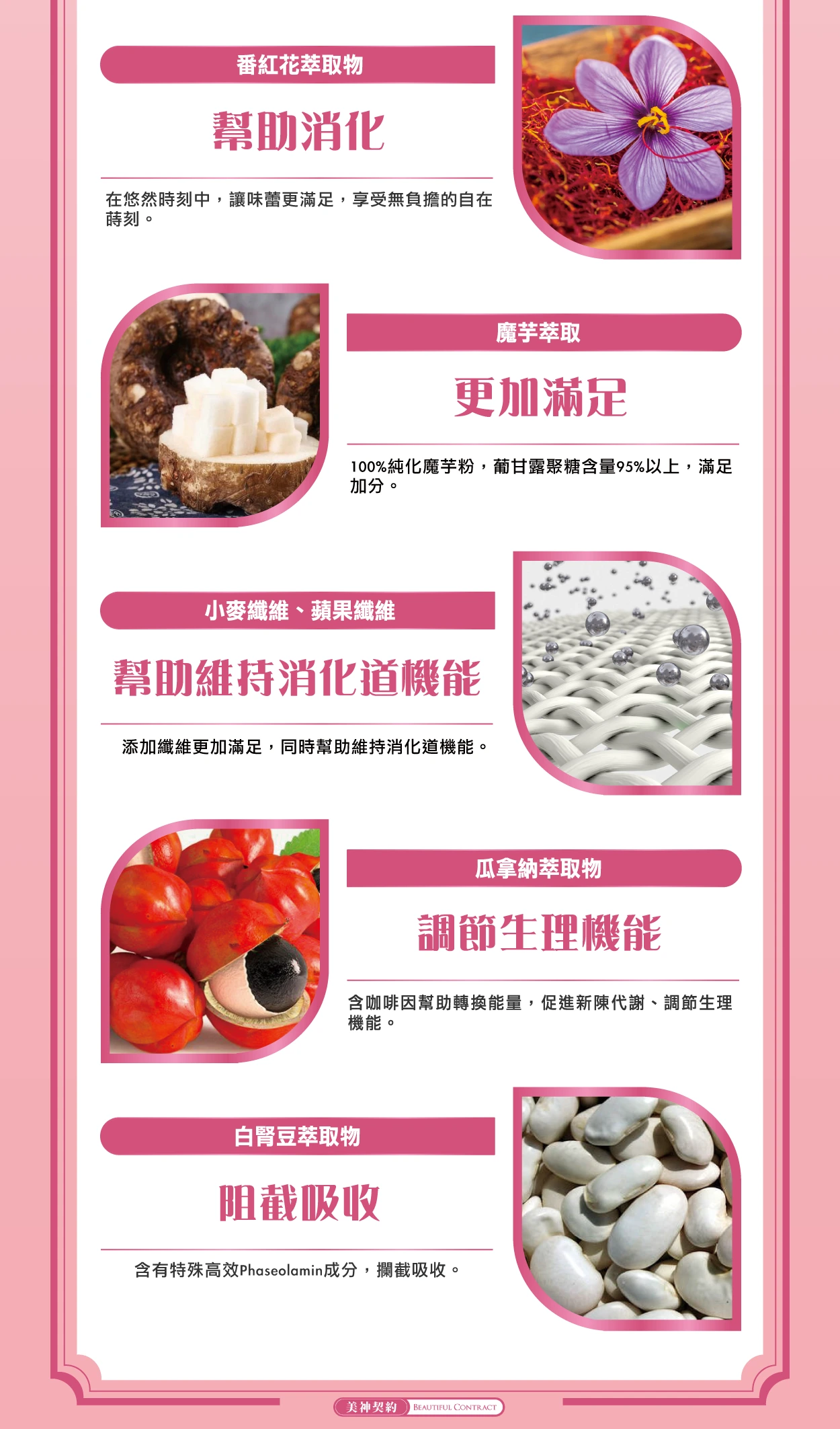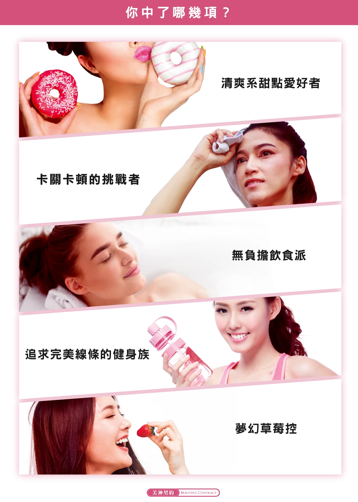 成分:MCT中鏈脂肪酸(中鏈脂肪酸甘油酯、辛烯基丁二酸鈉澱粉、脂肪酸甘油酯(植物性)、乳酸硬脂酸鈉、二氧化矽、麥芽糊精、碳酸鈣、酪蛋白鈉、維生素E (抗氧化劑)) 、小麥纖維、全脂奶粉、草莓粒、草莓粉、蘋果纖維、莓果百科(巴西莓、蔓越莓、覆盆莓、藍莓、石榴、草莓、麥芽糊精、西印度櫻桃、黑莓、山竹果、智利酒果、葡萄籽、枸杞)、紅花籽油CLA、瓜拿納萃取物、魔芋粉、甜菜根粉、專利櫻花萃取物(麥芽糊精、櫻花提取物、抗壞血酸、蘋果酸)、專利蠶絲蛋白(蠶絲蛋白、樹薯糊精) 、專利燕窩萃取物(麥芽糊精、燕窩提取物)、LeptiCore®專利複合式植物萃取(關華豆、刺槐豆、阿拉伯膠、石榴、Beta-胡蘿蔔素、束絲藻)、番紅花萃取物、白腎豆萃取物、大豆卵磷脂(含磷脂醯膽鹼、糊精、二氧化矽)、藤黃果萃取物、非洲芒果種子萃取物、專利野櫻莓萃取(野櫻莓萃取、麥芽糊精)、蔗糖素(甜味劑)。