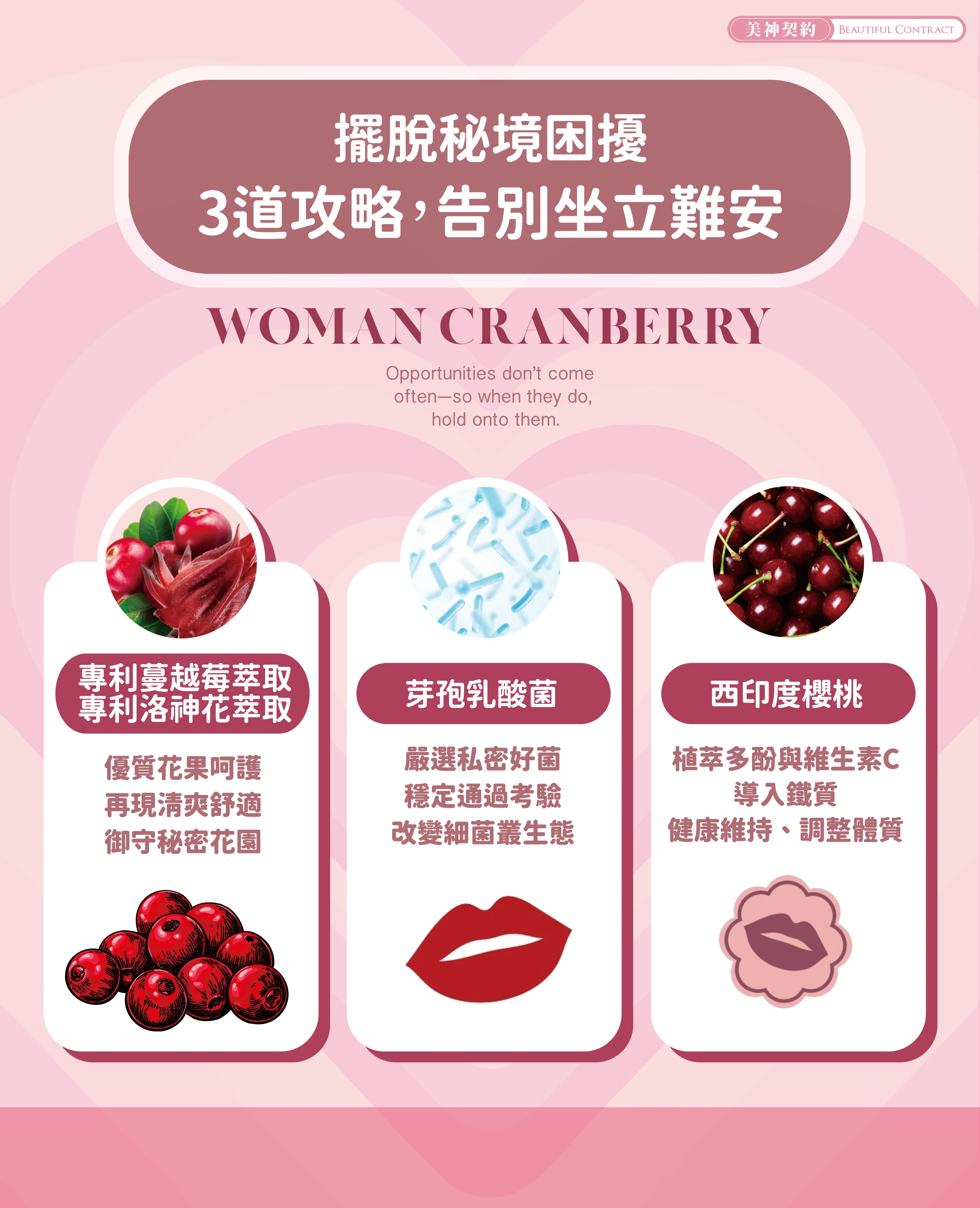 成分:FG66專利蔓越莓萃取物(800倍濃縮蔓越莓取物、蔓越莓萃取物(前花青素>65%)、麥芽糊精)、D-甘露糖、西印度櫻桃萃取物(含維生素C)、專利洛神花萼(含洛神花萃取)、專利芽孢乳酸菌(麥芽糊精、凝結芽孢桿菌)、橄欖葉萃取物、葡萄籽萃取物、專利石榴萃取物、蔓越莓濃縮粉(蔓越莓濃縮汁、麥芽糊精)、沙棘籽油粉(沙棘籽油、小麥纖維、糊精、維生素E)、專利南瓜籽萃取物、專利複合甘氨酸亞鐵(甘氨酸亞鐵、檸檬酸、麥芽糊精、二氧化矽)、硬脂酸鎂、甜菊萃取物(甜味劑)。