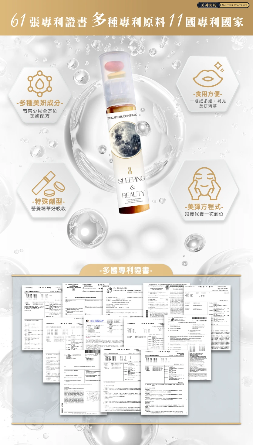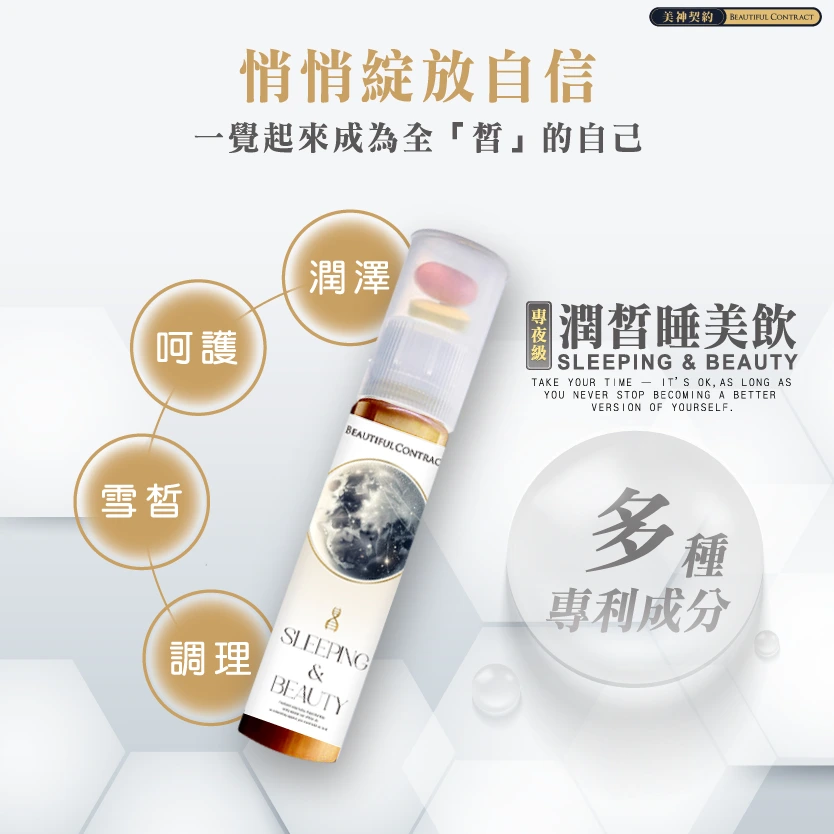 睡美飲成分:純水、異麥芽寡醣漿、鳳梨粉(鳳梨原汁、麥芽糊精)、專利余甘子萃取物、專利綜合莓果萃取物(七仙莓)(麥芽糊精、黑莓果粉、黑醋栗果粉、藍莓果粉、草莓果粉、覆盆莓果粉、蔓越莓果粉、巴西莓果粉)、卡姆果萃取物(含維生素C)、流行鏈球菌發酵物(含透明質酸鈉)、番茄萃取物(冰晶番茄)、專利金絲燕窩萃取物、專利金頂側茸子實體萃取物、專利鮭魚精巢萃取物、鰹魚彈性蛋白。