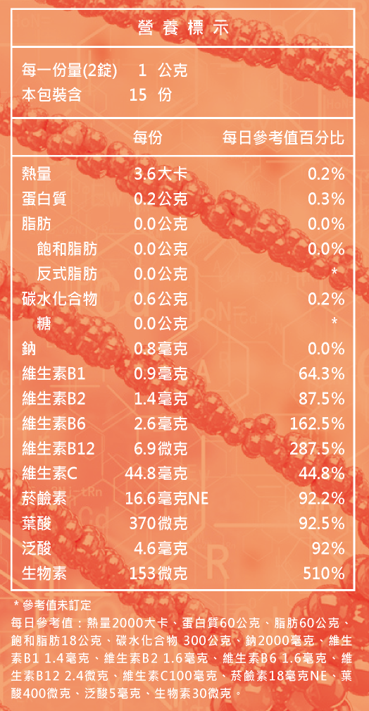 成分:啤酒酵母粉(含維生素B群)、柑橘萃取物、維生素C、專利黑胡椒萃取物、硬脂酸鎂。