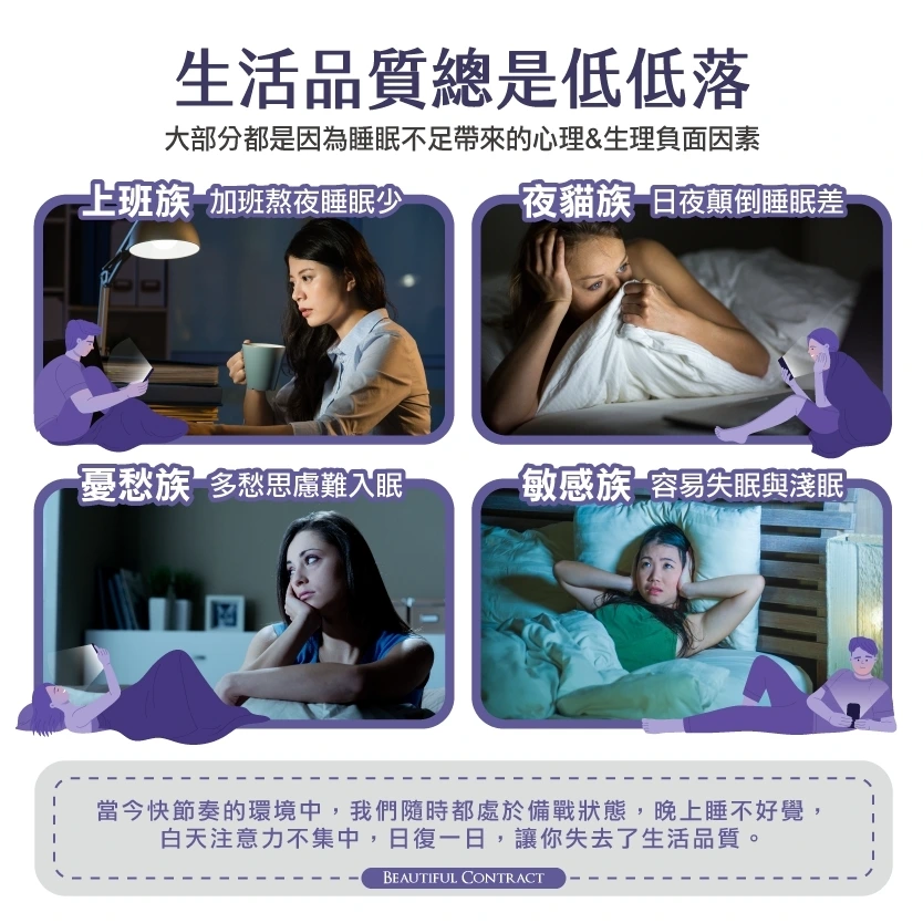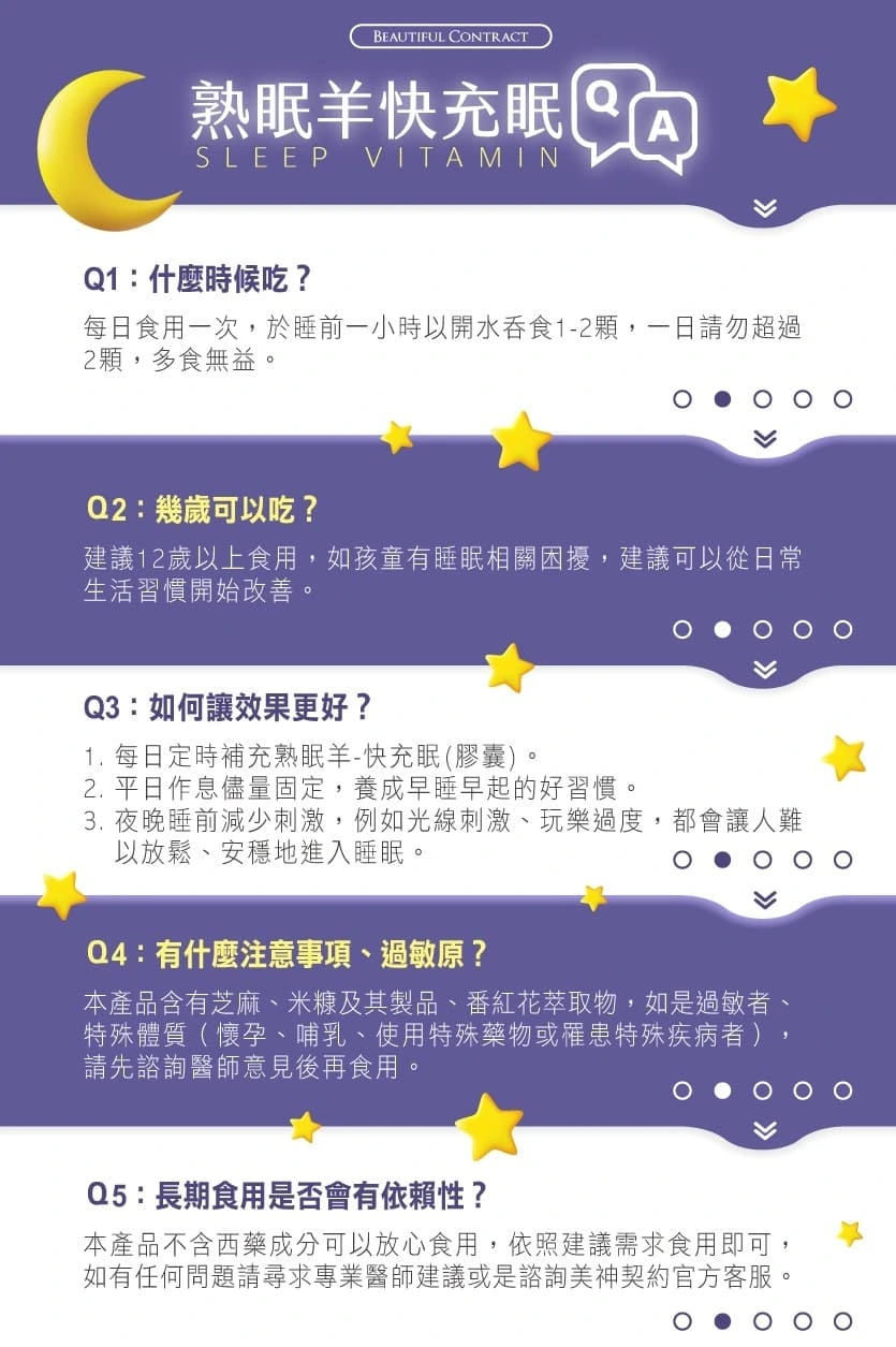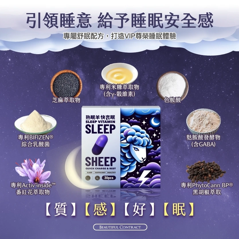 成分:麩胺酸發酵物(非基改玉米澱粉、麩胺酸發酵物(含r-aminobutyric acid,GABA)、乳酸菌)、專利米糠萃取物(含γ-穀維素)、L-色胺酸、BIFIZEN®綜合乳酸菌(麥芽糊精、B. longum 04 、L. fermentum LF16 、L. plantarum LP01、L. rhamnosus LR06 )、專利番紅花萃取物、芝麻萃取物、專利黑胡椒萃取物(黑胡椒萃取物、玉米澱粉、特級冷壓橄欖油、維生素E)(含ß-石竹烯)、維生素E、硬脂酸鎂。