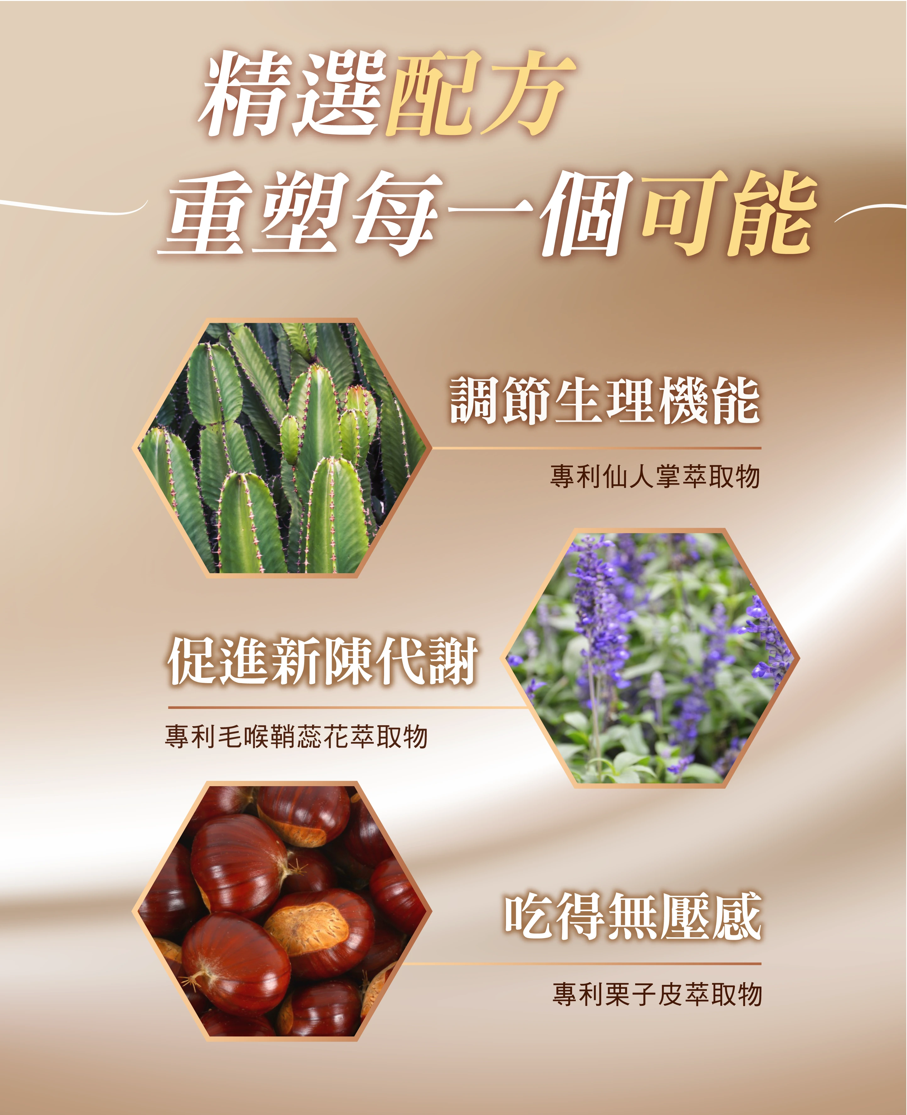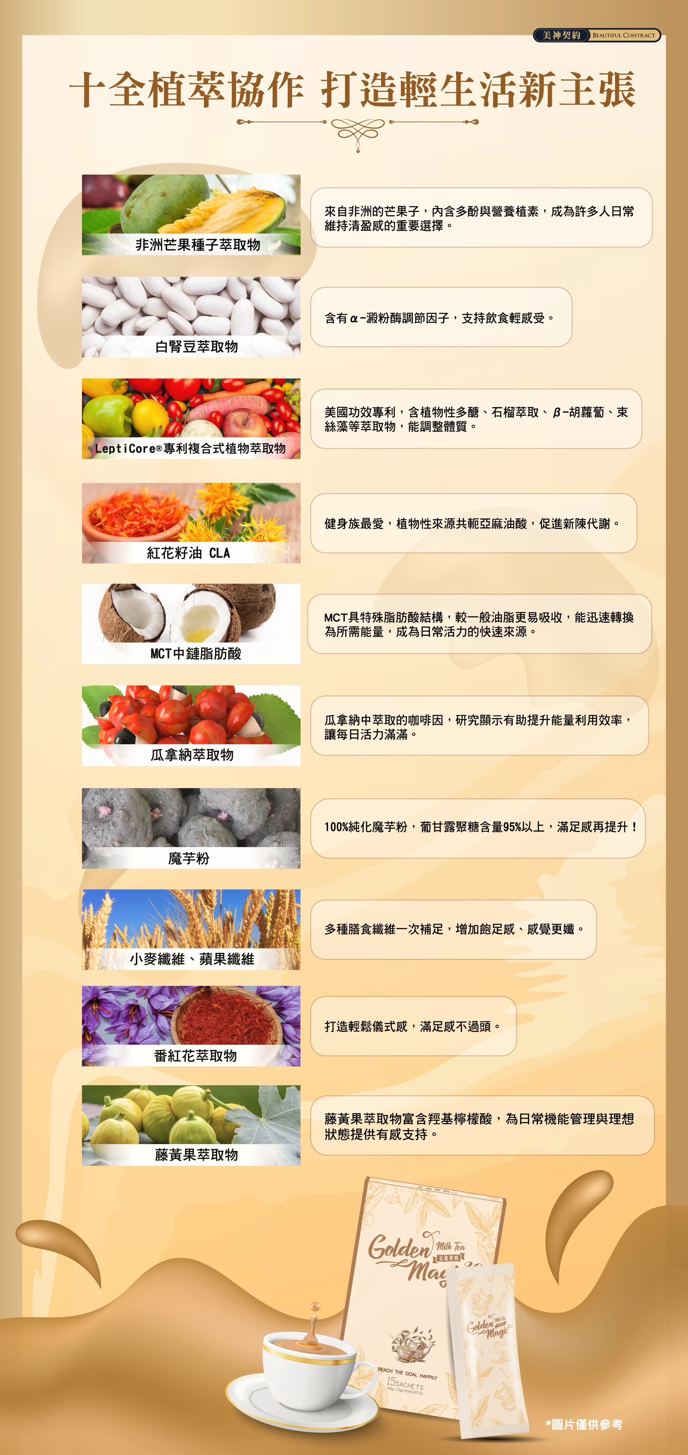 成分:特選即溶紅茶粉(伯爵紅茶)、全脂奶粉、MCT中鏈脂肪酸(中鏈脂肪酸甘油酯、辛烯基丁二酸鈉澱粉、脂肪酸甘油酯(植物性)、乳酸硬脂酸鈉、二氧化矽、麥芽糊精、碳酸鈣、酪蛋白鈉、維生素E (抗氧化劑)) 、小麥纖維、紅花籽油、瓜拿納萃取物、魔芋、蘋果纖維、甜菜根粉、蔓越莓萃取粉、洋車前子粉、Lepticore®專利複合式植物萃取(關華豆、刺槐豆、阿拉伯膠、石榴、Beta-胡蘿蔔素、束絲藻)、(專利)仙人掌萃取物、番紅花萃取物、(專利)毛喉鞘蕊花萃取物、(專利)栗子皮萃取物、白腎豆萃取物、大豆卵磷脂(含磷脂醯膽鹼、糊精、二氧化矽)、藤黃果萃取物、非洲芒果種子萃取物、蔗糖素。