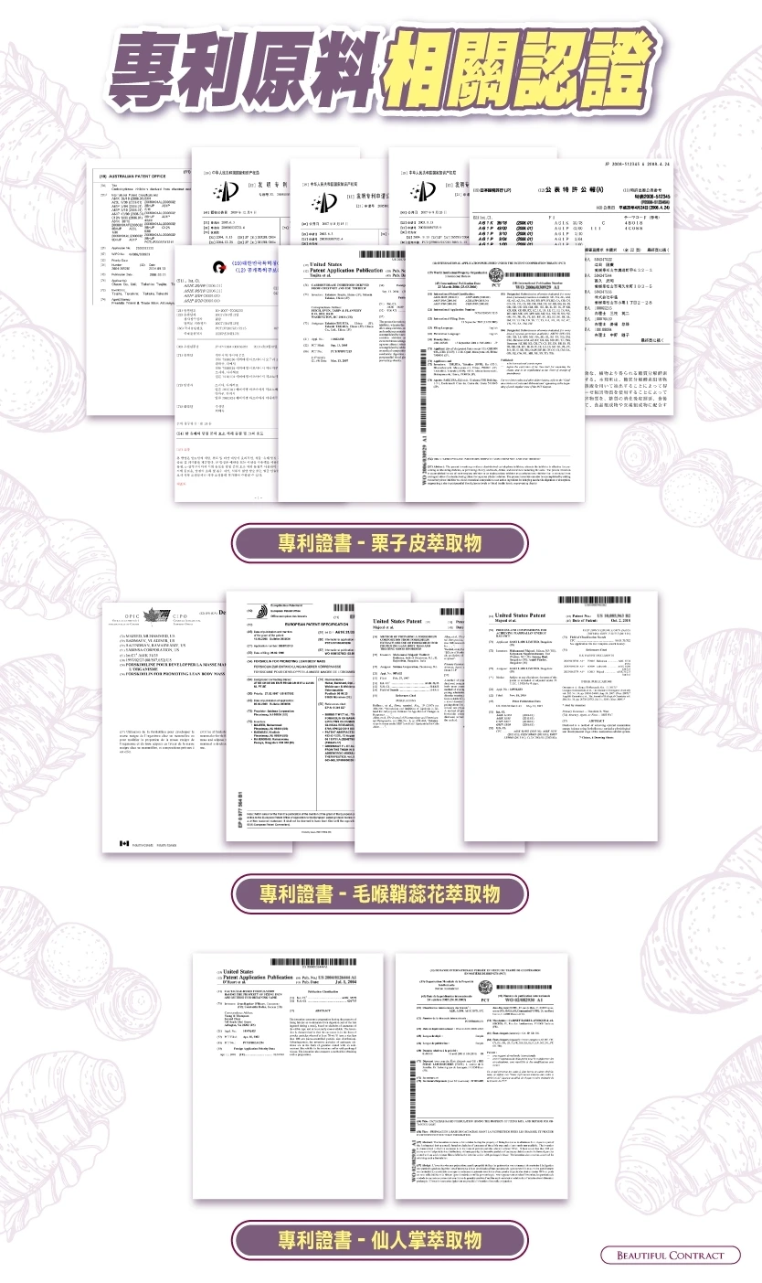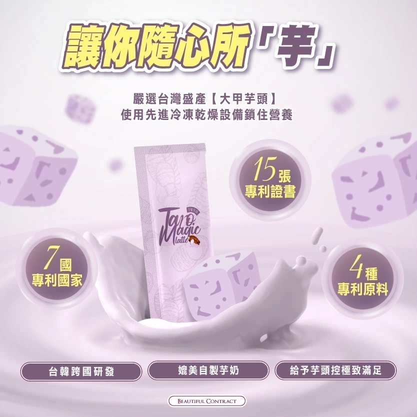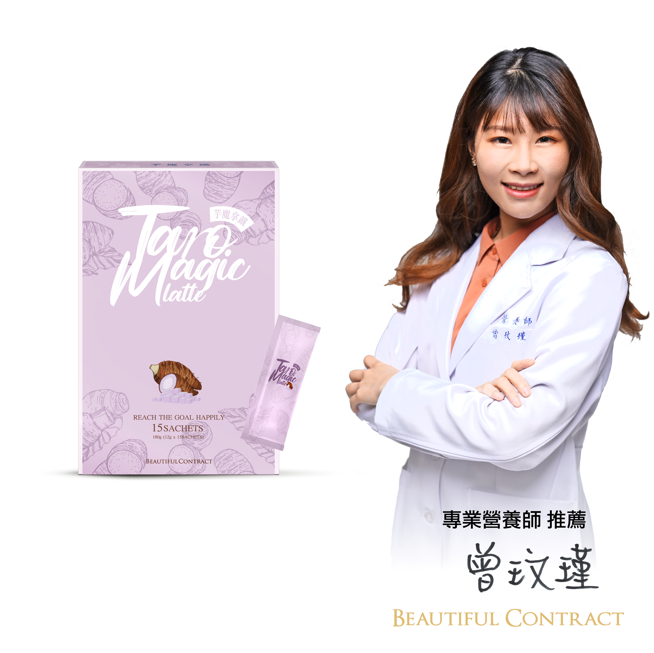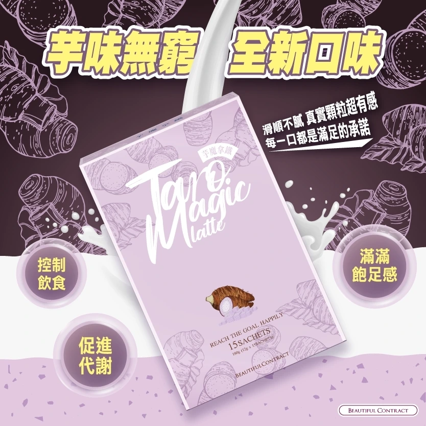 成分:芋頭粉、小麥纖維、全脂奶粉、 MCT中鏈脂肪酸(中鏈脂肪酸甘油酯、辛烯基丁二酸鈉澱粉、脂肪酸甘油酯(植物性)、乳酸硬脂酸鈉、二氧化矽、麥芽糊精、碳酸鈣、酪蛋白鈉、維生素E (抗氧化劑))、紅花籽油(紅花籽油、麥芽糊精)、瓜拿納萃取物、 魔芋粉、蘋果纖維、甜菜根粉、蔓越莓萃取粉、洋車前子粉、 Lepticore專利複合式植物萃取(關華豆、刺槐豆、阿拉伯膠、石榴、Beta-胡蘿蔔素、束絲藻) 、(專利)仙人掌萃取物、番紅花萃取物、(專利)毛喉鞘蕊花萃取物、栗子皮萃取物、 白腎豆萃取物、大豆卵磷脂(含磷脂醯膽鹼、糊精、二氧化矽)、藤黃果萃取物、非洲芒果種子萃取物、蔗糖素。