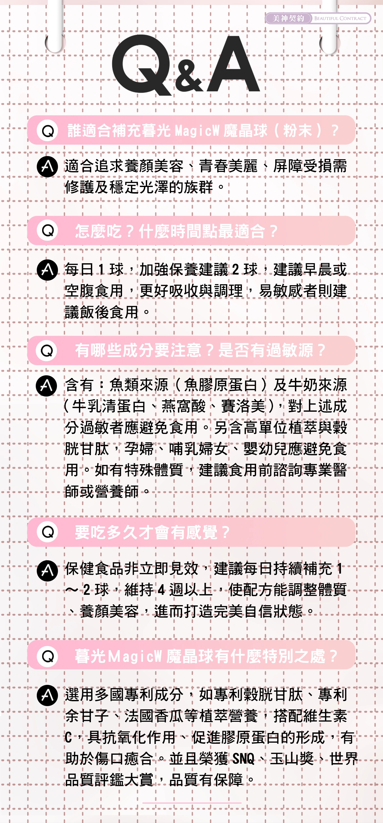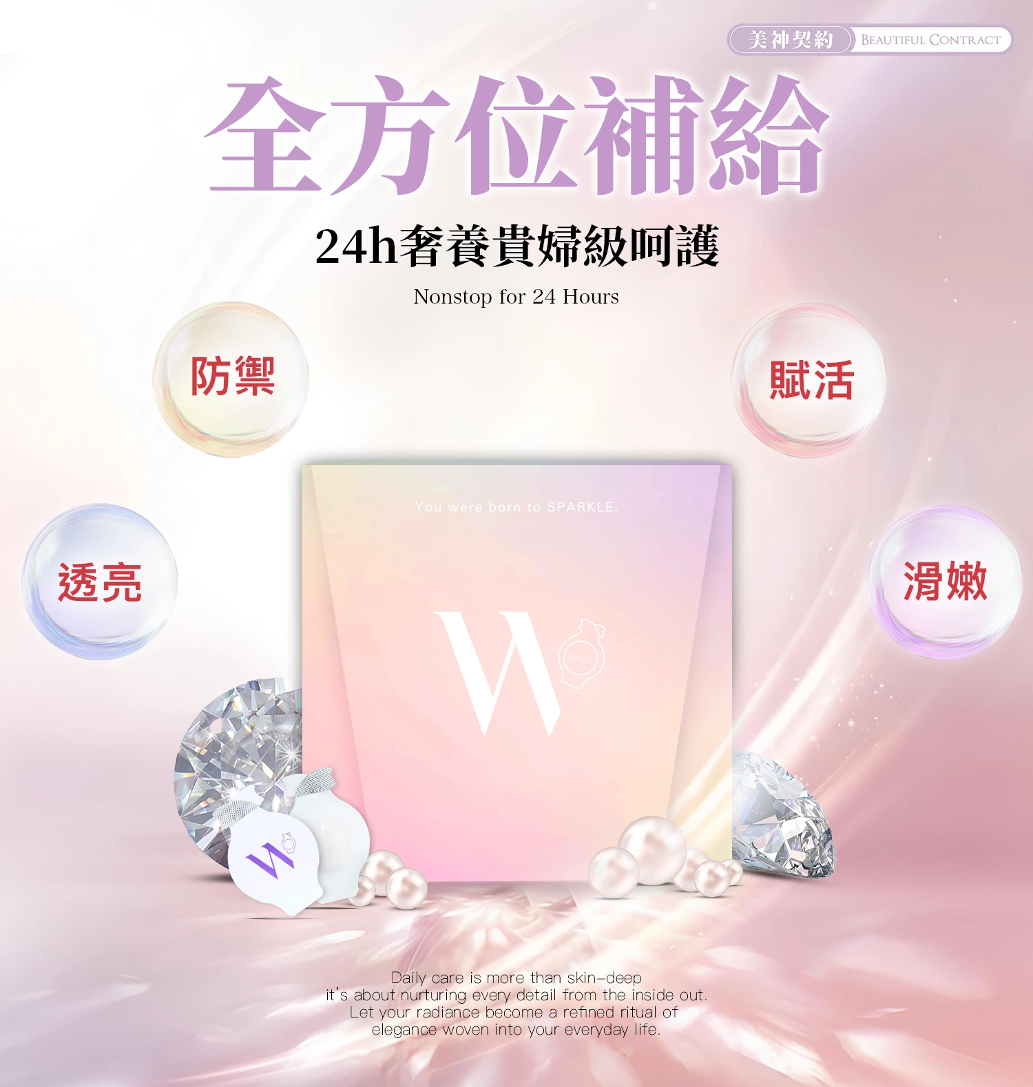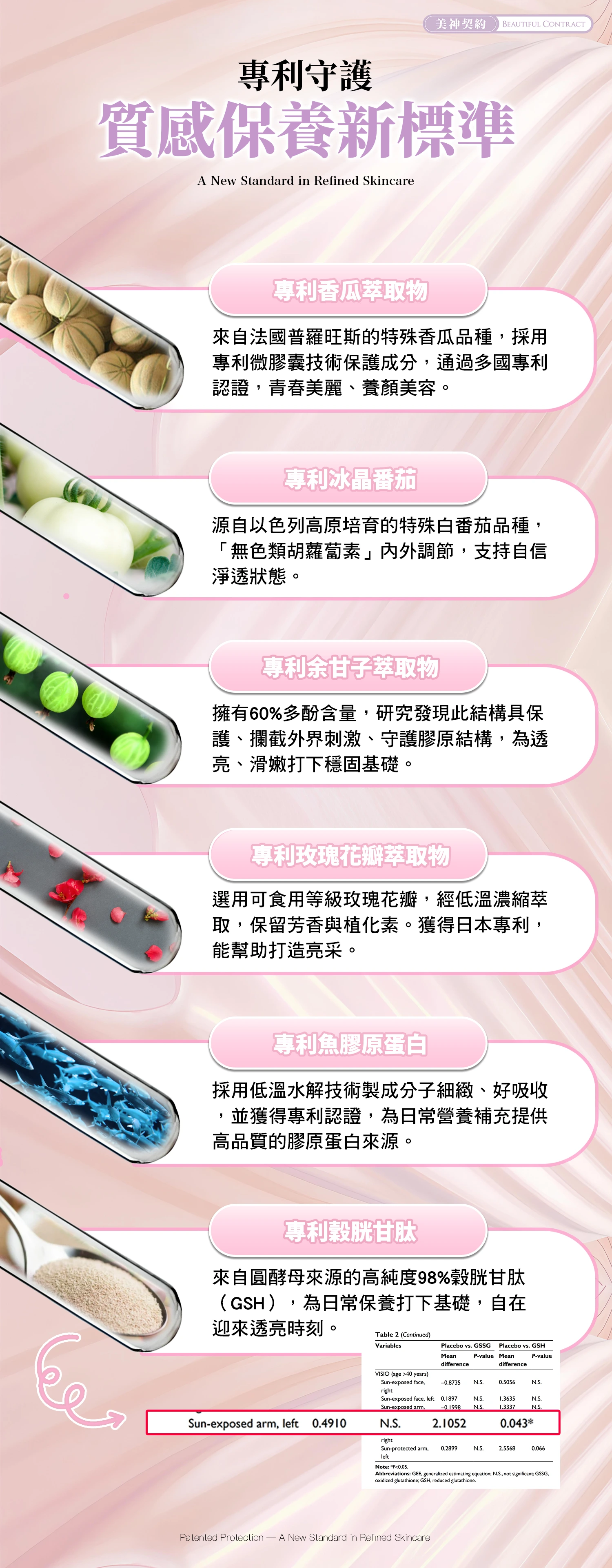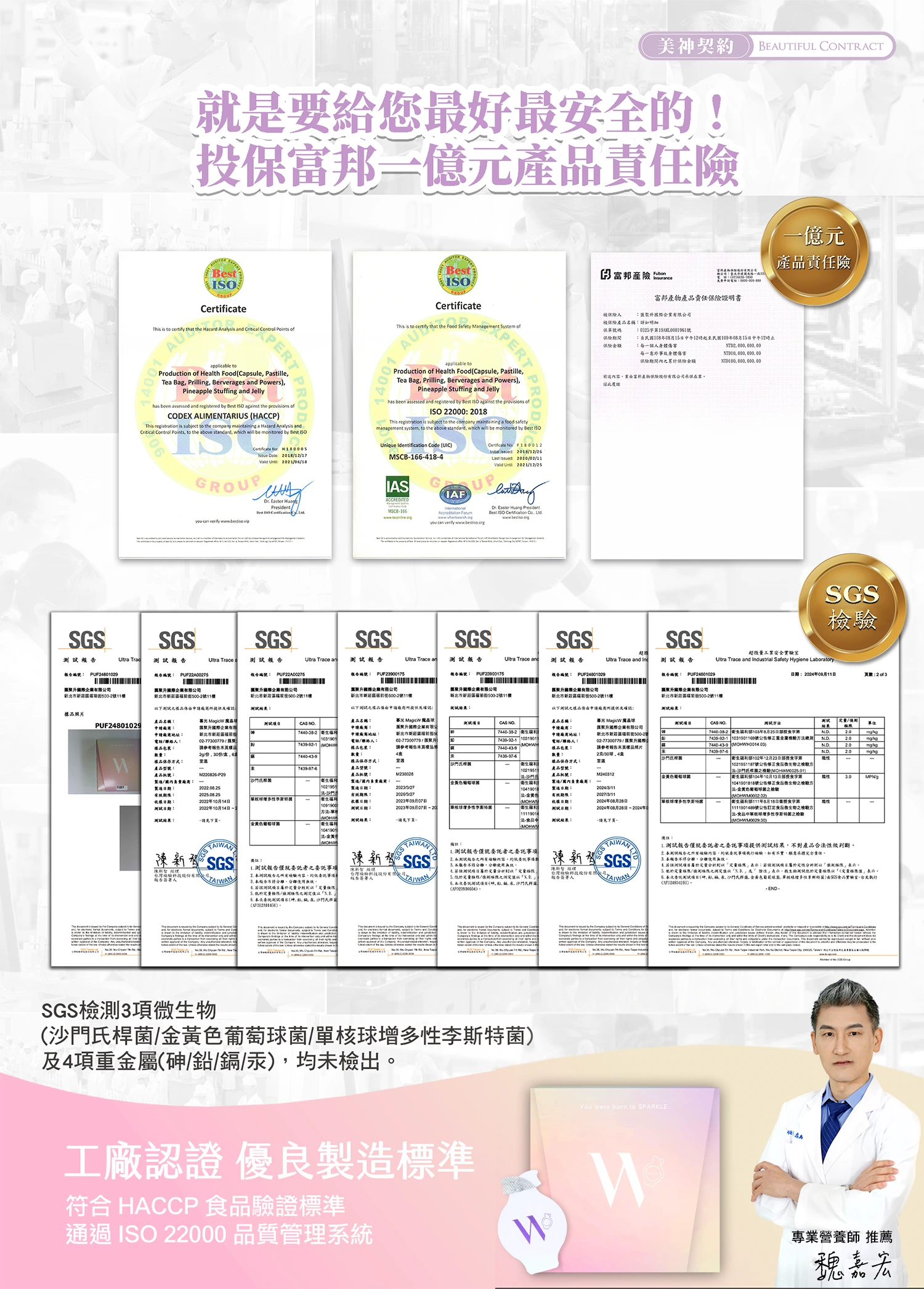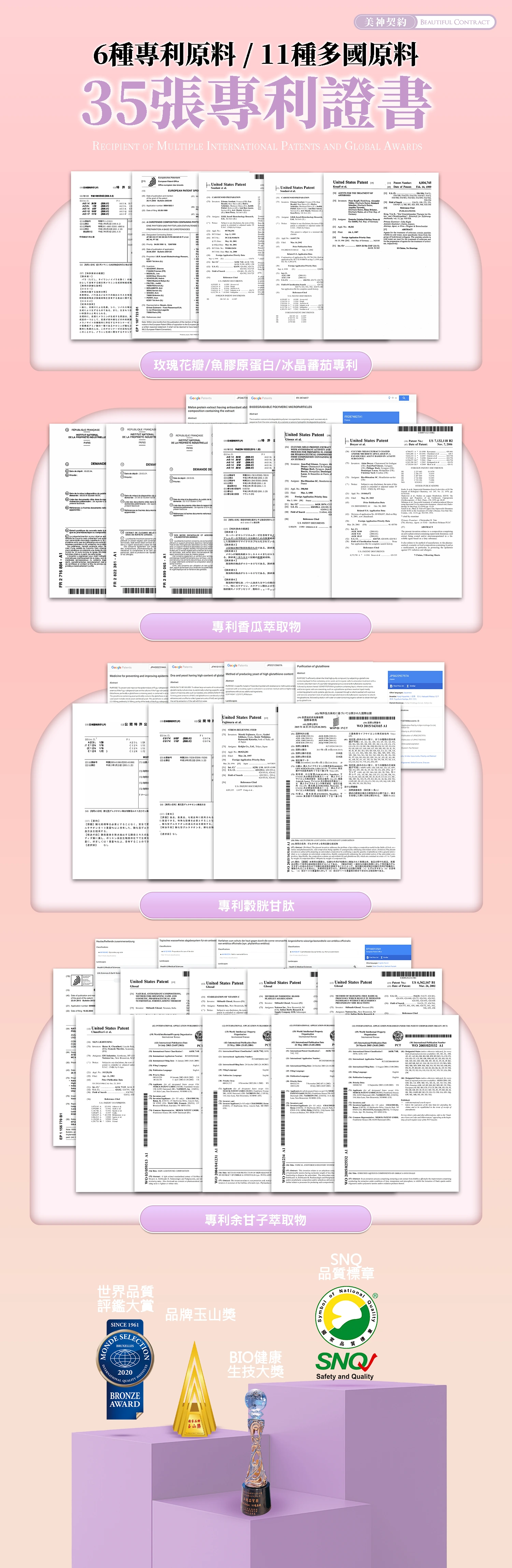 成分:鳳梨濃縮粉(鳳梨濃縮汁、麥芽糊精)、二型膠原蛋白、專利余甘子萃取(含鞣花酸、鞣花丹寧)、專利魚膠原蛋白、專利香瓜萃取物、血橙萃取物、葡萄籽萃取物、穀胱甘肽(GSH98%,圓酵母來源)、專利冰晶番茄(白番茄萃取物)、卡姆果萃取物、專利玫瑰花瓣萃取物、橄欖葉萃取物(橄欖葉萃取物、麥芽糊精)、抗壞血酸(維生素C)、鳳梨萃取物(含鳳梨酵素)、綜合莓果萃取物(山桑子、草莓、蔓越莓、葡萄籽、藍莓、覆盆莓、石榴、微晶纖維素)、牛乳清蛋白萃取物(含燕窩酸)、牛乳萃取物(含賽洛美)。
