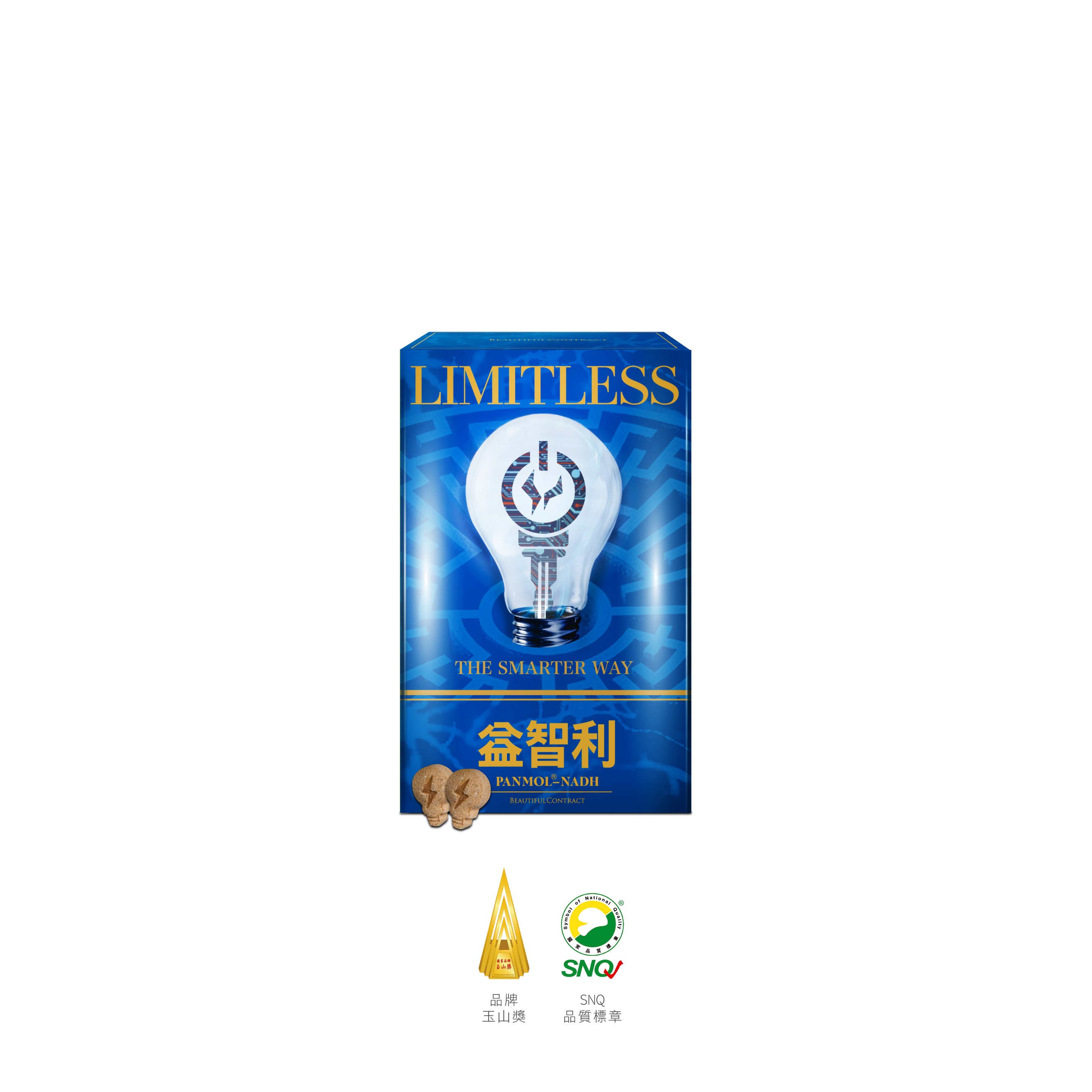 成 分:專利大豆萃取物(含磷脂醯絲胺酸)、靈芝子實體(Ganoderma lucidum,固態培養) 、專利綠薄荷抽出物、專利C3薑黃萃取物、專利菸鹼醯胺複合物PANMOL®NADH (棕櫚油、蜂蠟、葉綠素、菸鹼醯胺)、專利藻類萃取物(含DHA)、L-酪胺酸、麥芽糊精、硬脂酸鎂、維生素B6、羥丙基甲基纖維素、蔗糖素(甜味劑)、維生素B12。