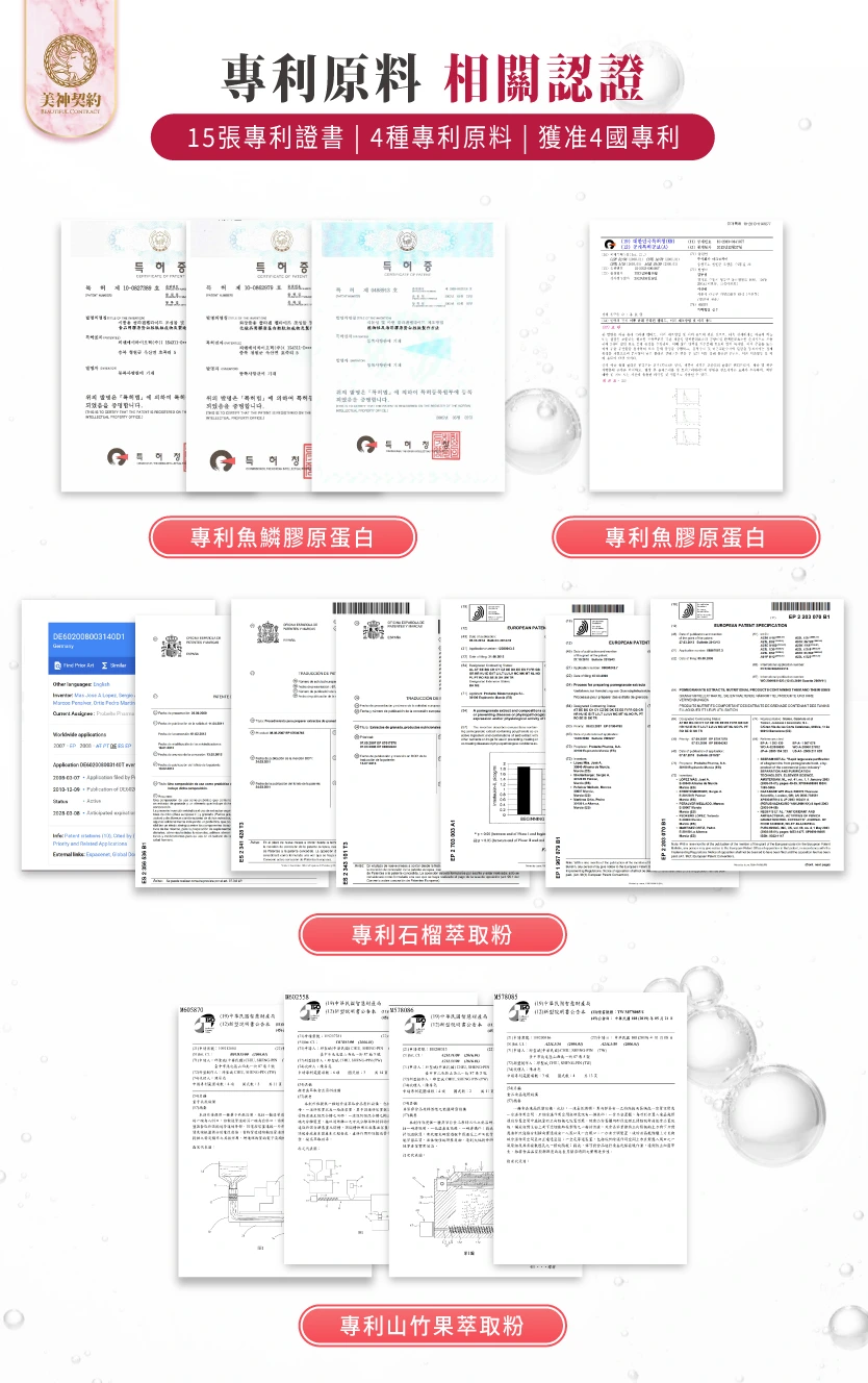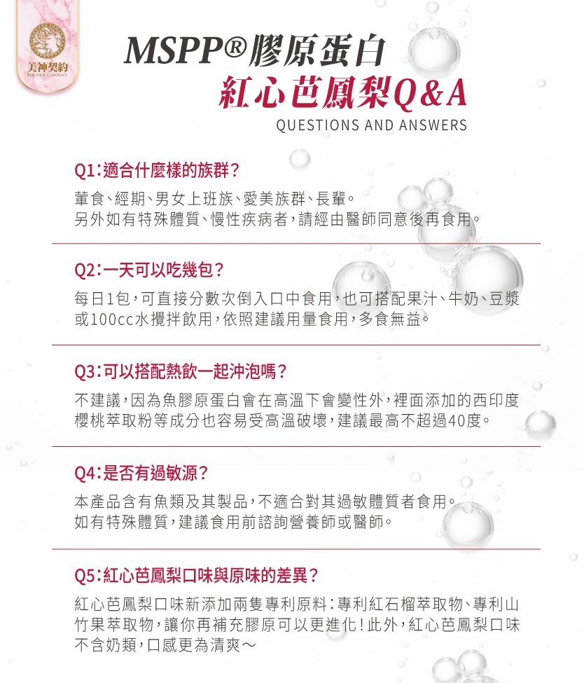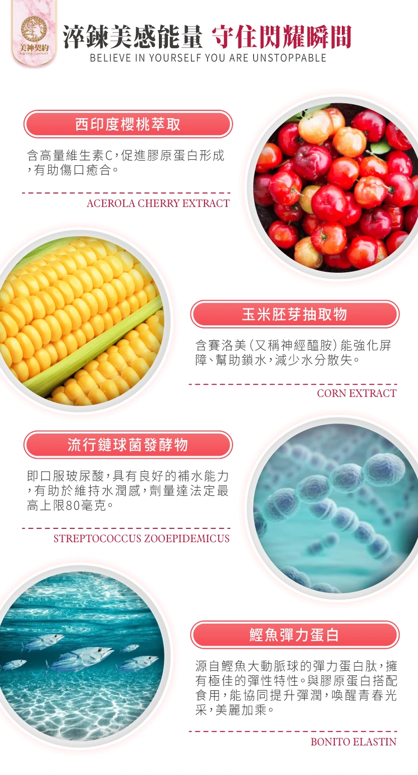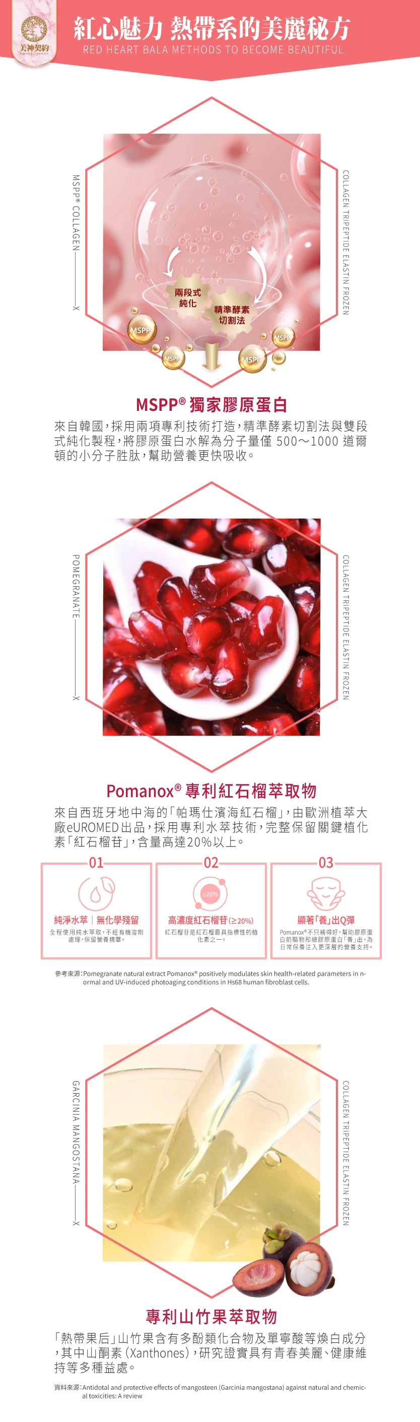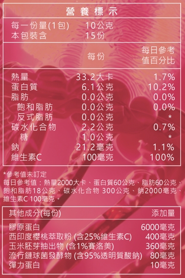 成分:MSPP®(專利魚鱗膠原蛋白、專利魚膠原蛋白)、紅心芭樂粉(芭樂原汁、麥芽糊精)、異麥芽寡醣粉、芭樂丁、西印度櫻桃萃取粉(西印度櫻桃提取物、玉米麥芽糊精) (含25%維生素C)、玉米胚芽抽出物(糊精、玉米提取物) (含1%賽洛美) 、鳳梨粉(鳳梨原汁、麥芽糊精)、專利紅石榴萃取物(紅石榴萃取物、麥芽糊精)、流行鏈球菌發酵物(含95%透明質酸鈉) 、專利山竹果萃取物、鰹魚彈力蛋白、甜菊萃取物(甜味劑)。